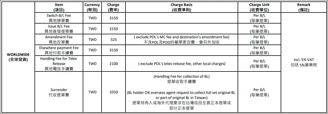 MSC Taiwan Local Charges – Export (Subject to 5% vat)