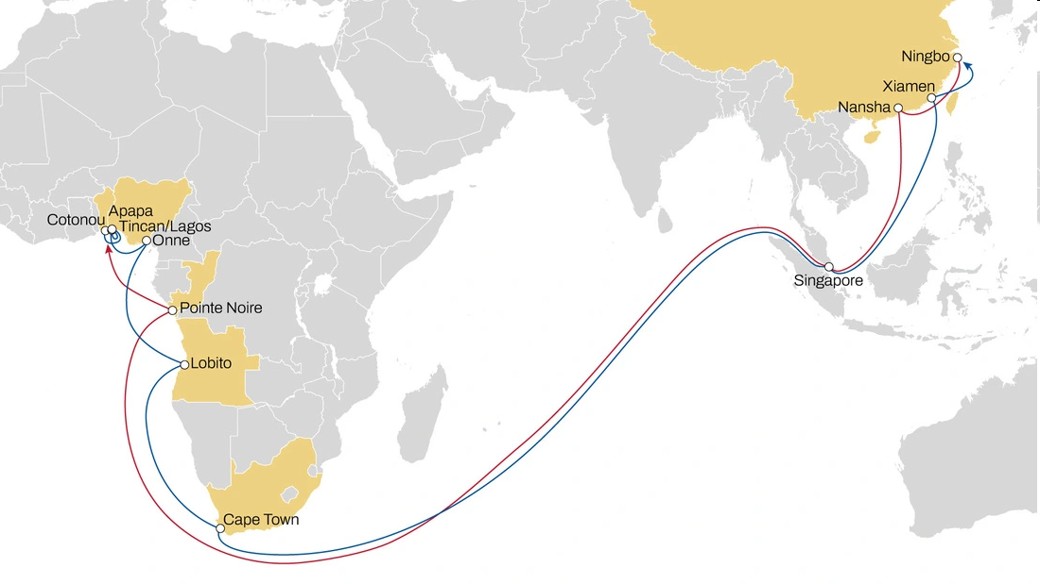 Ningbo – Nansha – Singapore – Pointe Noire – Cotonou – Apapa – Tincan – Onne –Lobito – Cape Town – Singapore – Xiamen – Ningbo