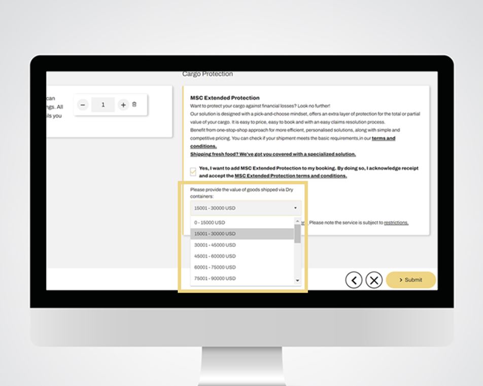 通过 MSC扩展保障,您可以选择所需保障的货物价值,包括部分和全额货物价值*保障。 尽享货物应有的全方位保障。